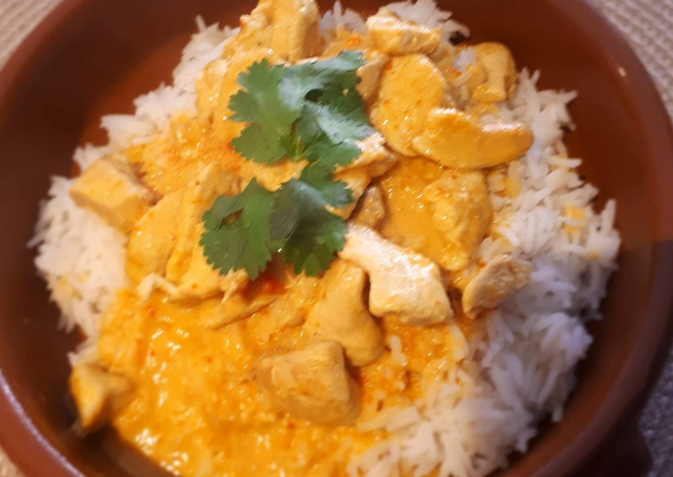 Hacer el arroz basamati en una olla aparte como indique el envase y reservar. - Cortar las verduras a cuadraditos, en la misma sartén donde hemos hecho el pollo, dorar las verduras, cuando estén hechas, echar el curry y el jengibre, remover y echar la leche de coco. Remover hasta que reduzca un poco.