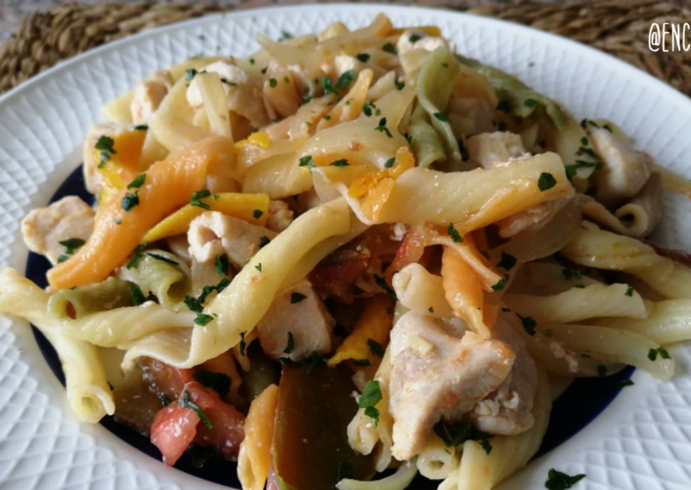 Strozzapreti tricolor con pollo, tomate y cebolla