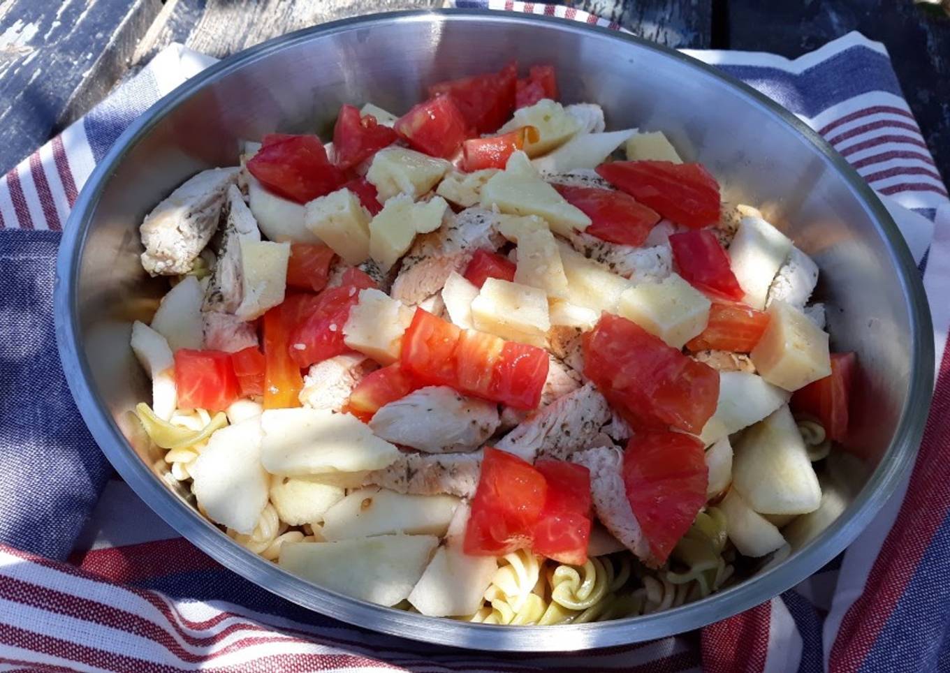 - Cuando la pechuga se haya cocinado y haya perdido calor, la cortamos en tiras, se agrega a la pasta y se incorporan las peras, el tomate y el queso.
