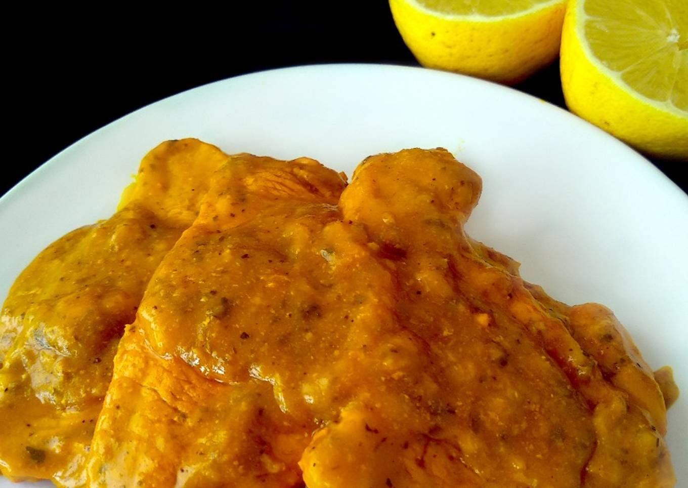 - Se mezcla en una fuente el zumo de limón junto con las especias, ralladura de limón y un poco de agua. Se pone dentro los filetes de pavo y se deja macerar toda la noche en la nevera tapado con film de cocina. Yo sólo lo dejé macerar unas horas porque no me dio tiempo pero aún así quedó bien: