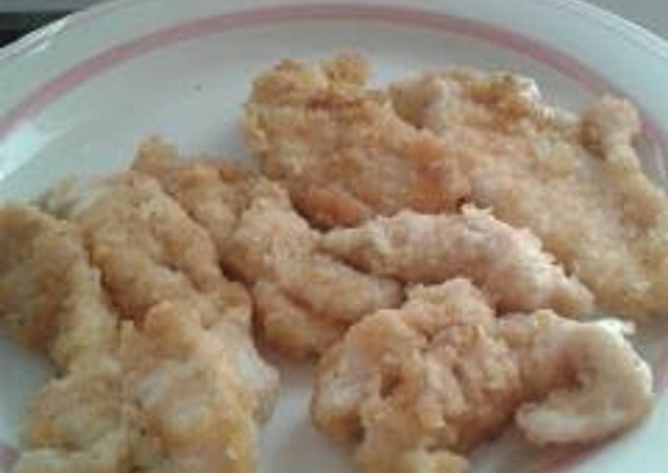 - Cortar las pechugas en tiras y poner en un bol junto con el pan rallado, la harina (no mucha cantidad) la sal la pimienta y el huevo. Freirlas en abundante aceite caliente.
