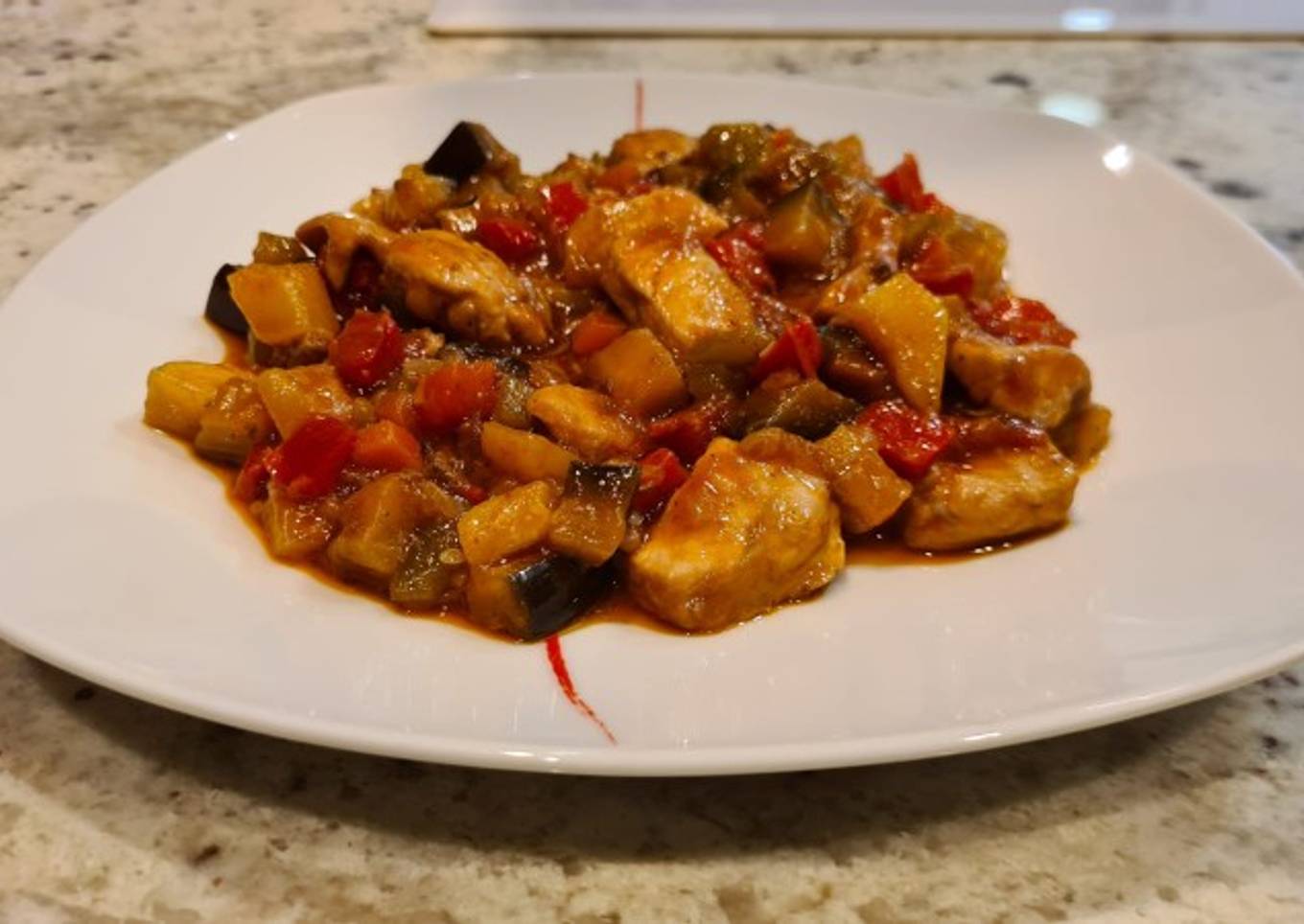 - Como siempre agrupamos todos los ingredientes. Cortamos en brunoise la cebolla y en cuadraditos los pimientos y la berenjena. Pelamos el calabacín y lo troceamos en cubos. Troceamos las pechugas en tamaño bocado.