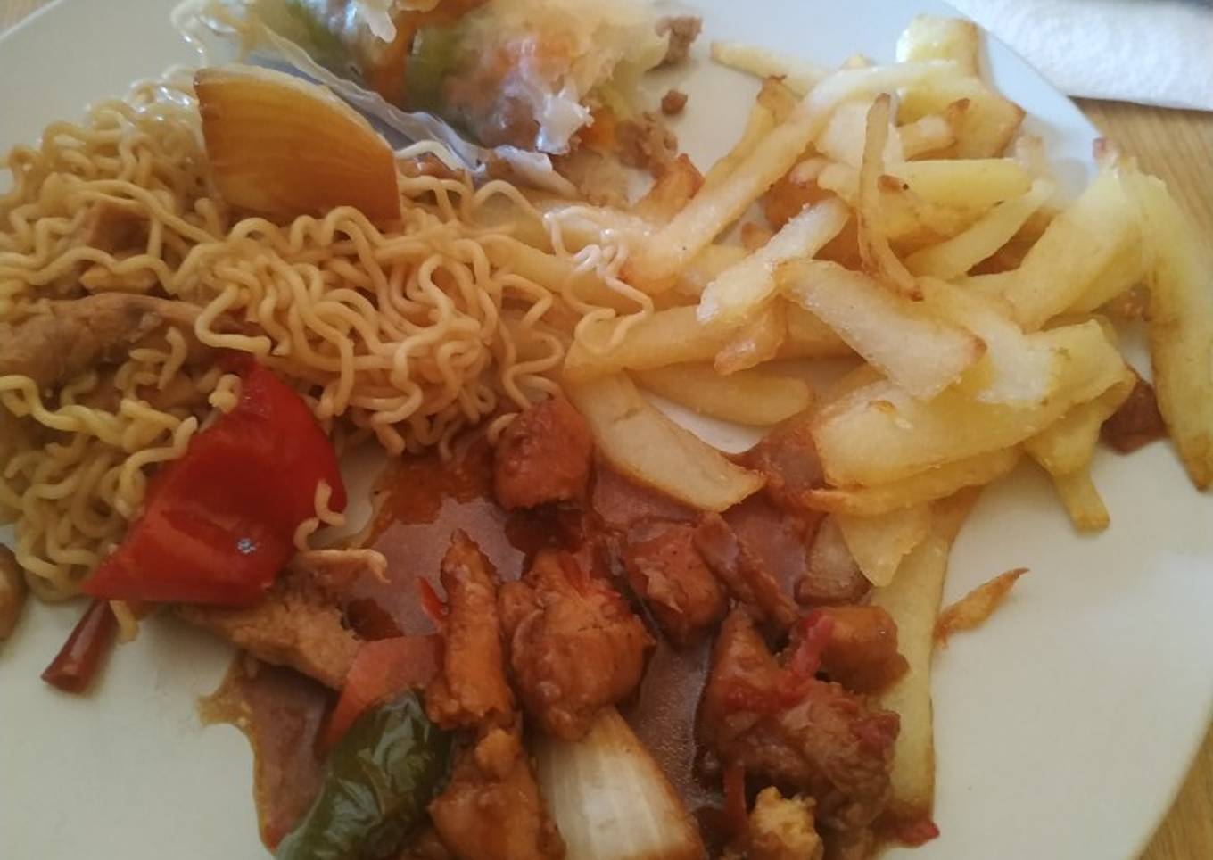 - Tenemos listo nuestro pollo asiático y separamos la mitad en un plato y mezclamos con los nodiees