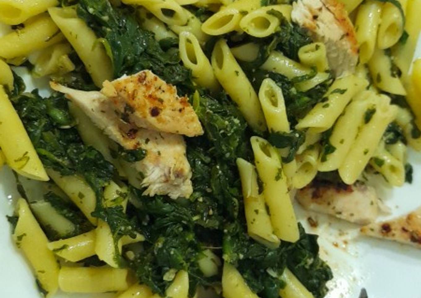 - En una sartén ponemos una cuchara de mantequilla y doramos el pollo y el ajo, ponemos la espinaca y dejamos 5-10 minutos más, salpimentamos al gusto, ponemos los macarrones y servimos.👌👌