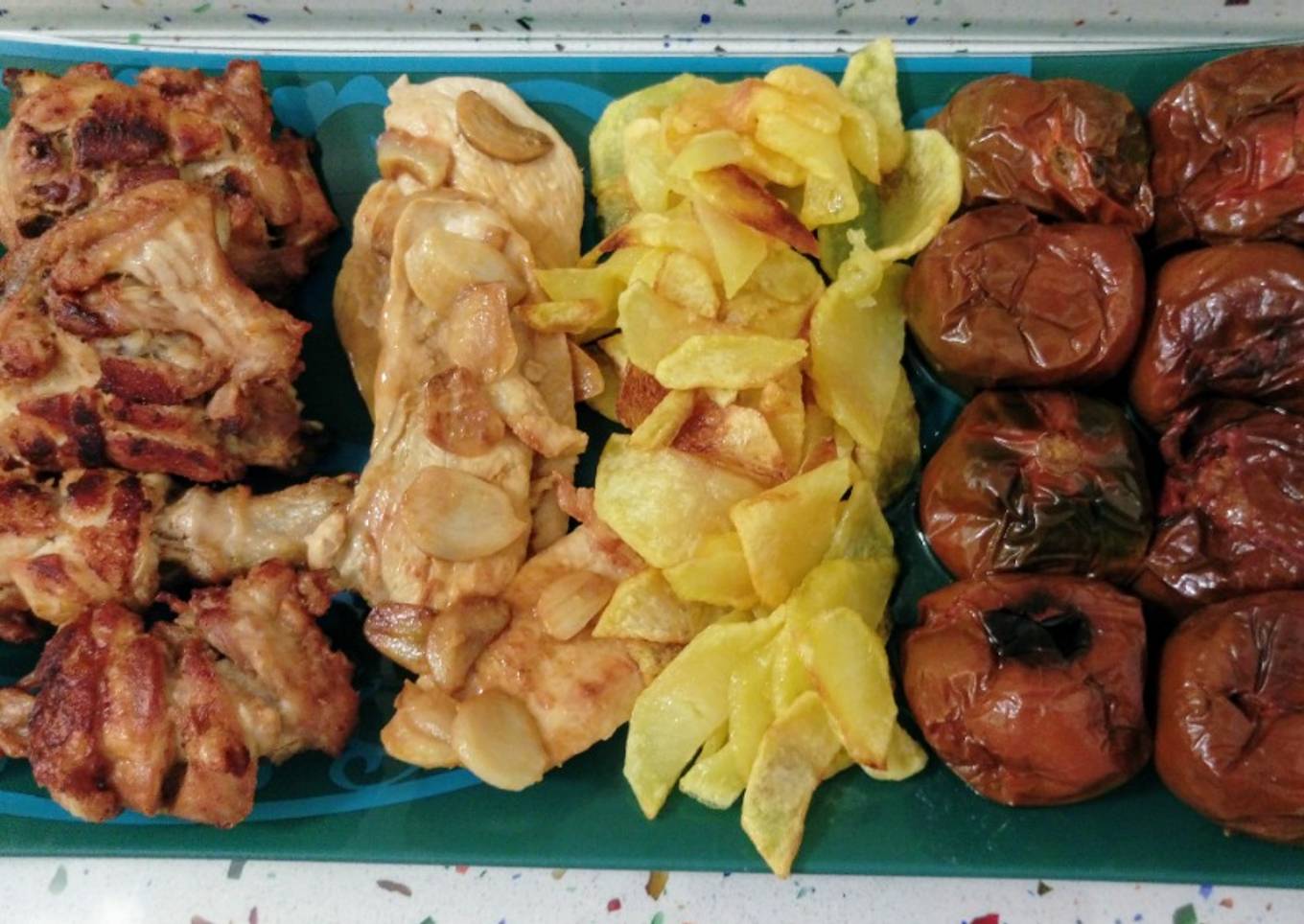 Pollo al ajillo con patatas fritas y tomates kumato asados