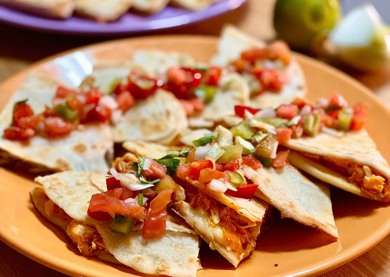 - Una vez listos todos los tipos de quesadilla, las cortamos en triángulos y servimos acompañadas del pico de gallo que le dará ese toque fresco que le va genial ¡¡Espero que os gusten!!