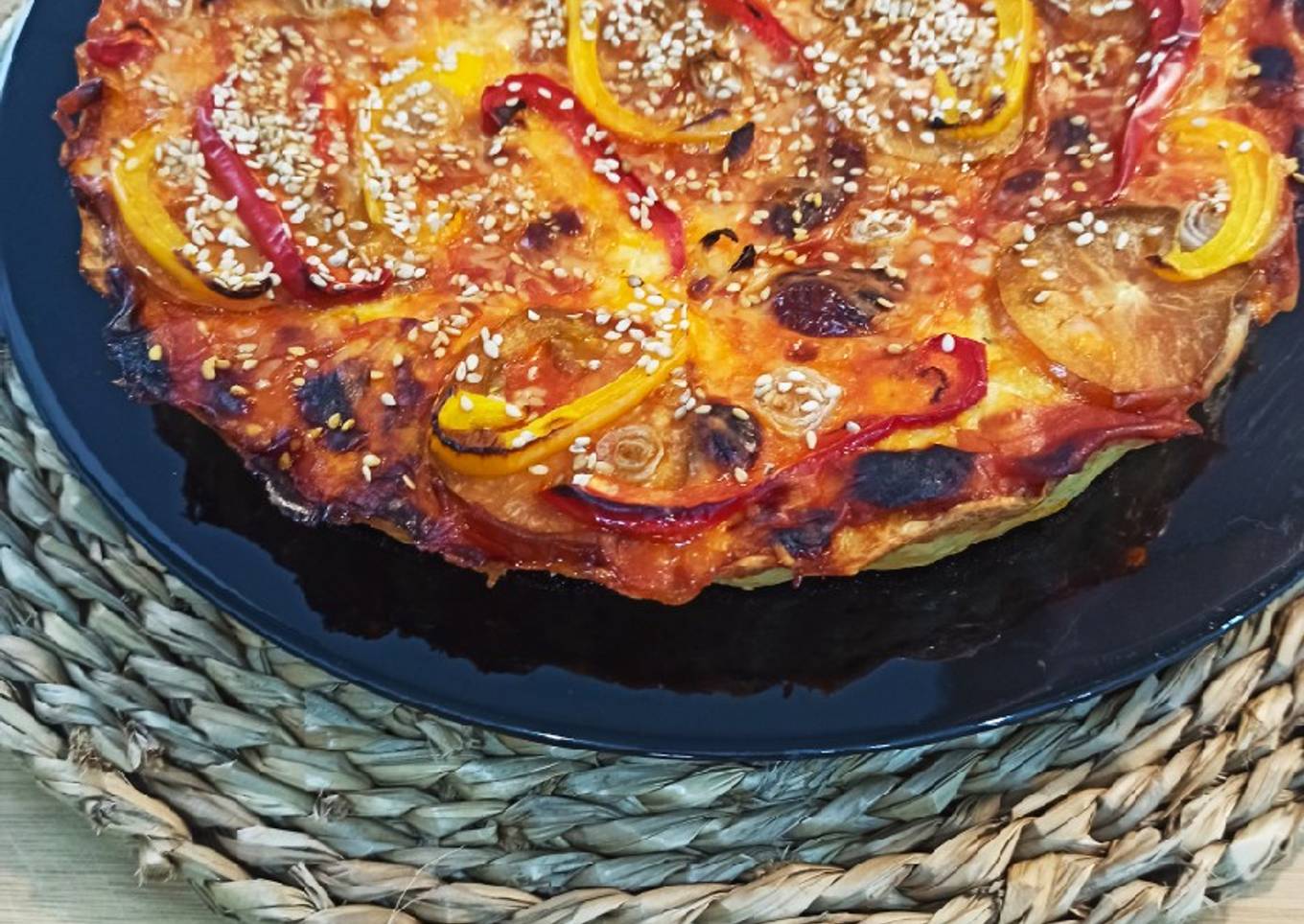 - Mientras se cocina la base de la quiche, cortaremos el resto de ingredientes. Sacamos el molde del horno y colocamos sobre una rejilla. Con cuidado de no quemarnos, extendemos 2-3 cucharadas de salsa de tomate ya preparada (yo he utilizado la de tomate y cebolla del Lidl), espolvoreamos un poco de queso mozzarella rallado y distribuimos el resto de ingredientes por toda la superficie.