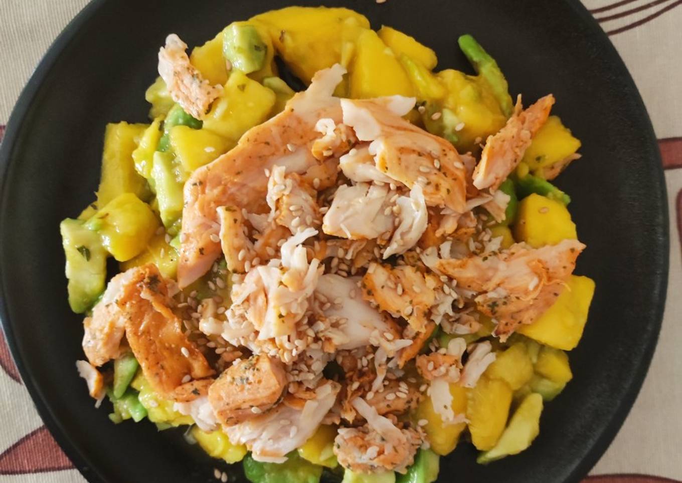 - Una vez que esté hecho el pollo, montamos nuestro tartar. Ponemos de base el aguacate y el mango y luego añadimos el pollo