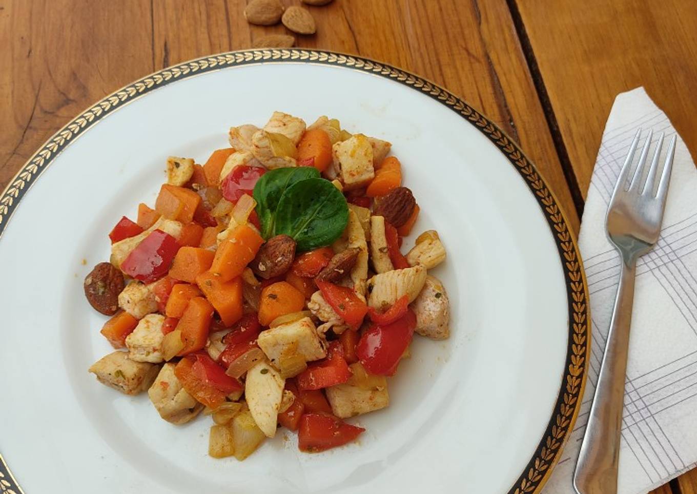 - En una sartén ponemos un chorrito de aceite y sofreímos unos 10 min toda la verdura, después incorporamos el pollo y las almendras, añadimos la sal, pimienta, orégano al gusto y el pimentón. Mezclamos todo y dejamos unos 3-4 min hasta que se haga el pollo y listo.