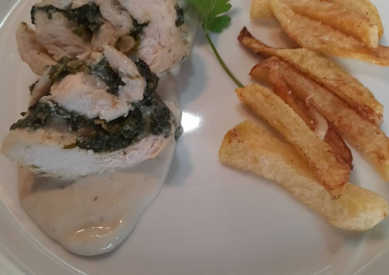 Pollo relleno de espinacas y queso de cabra en salsa de queso