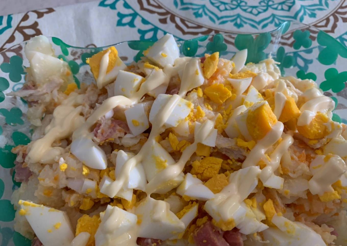 Ensalada de patata π₯ con huevo π₯ pollo π zanahoria π₯ salchichas y un poco de mahonesa π