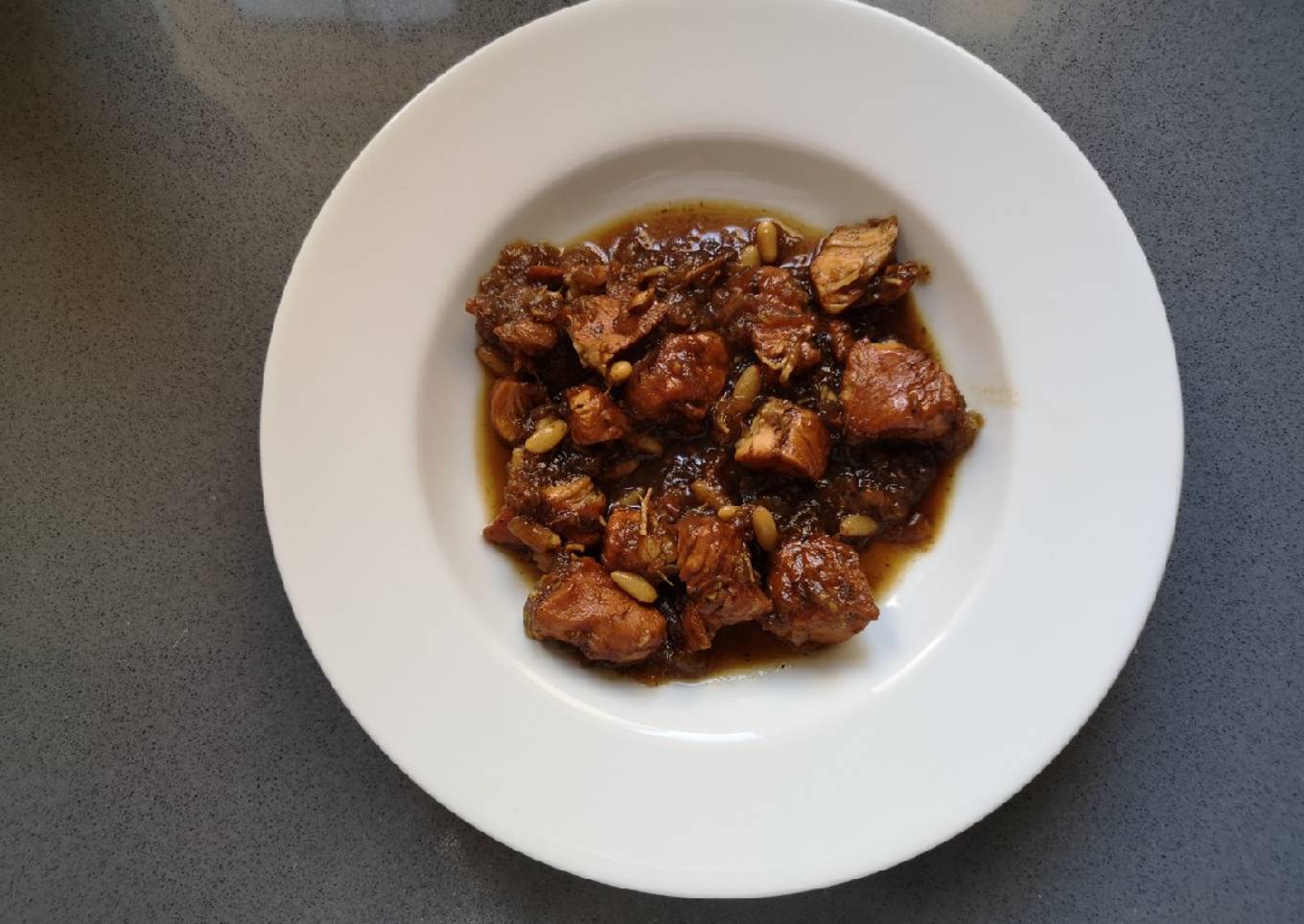 - Mientras la cebolla va pochando troceamos el pollo y agregamos, continuamos con el mismo programa hasta que el pollo tome color.