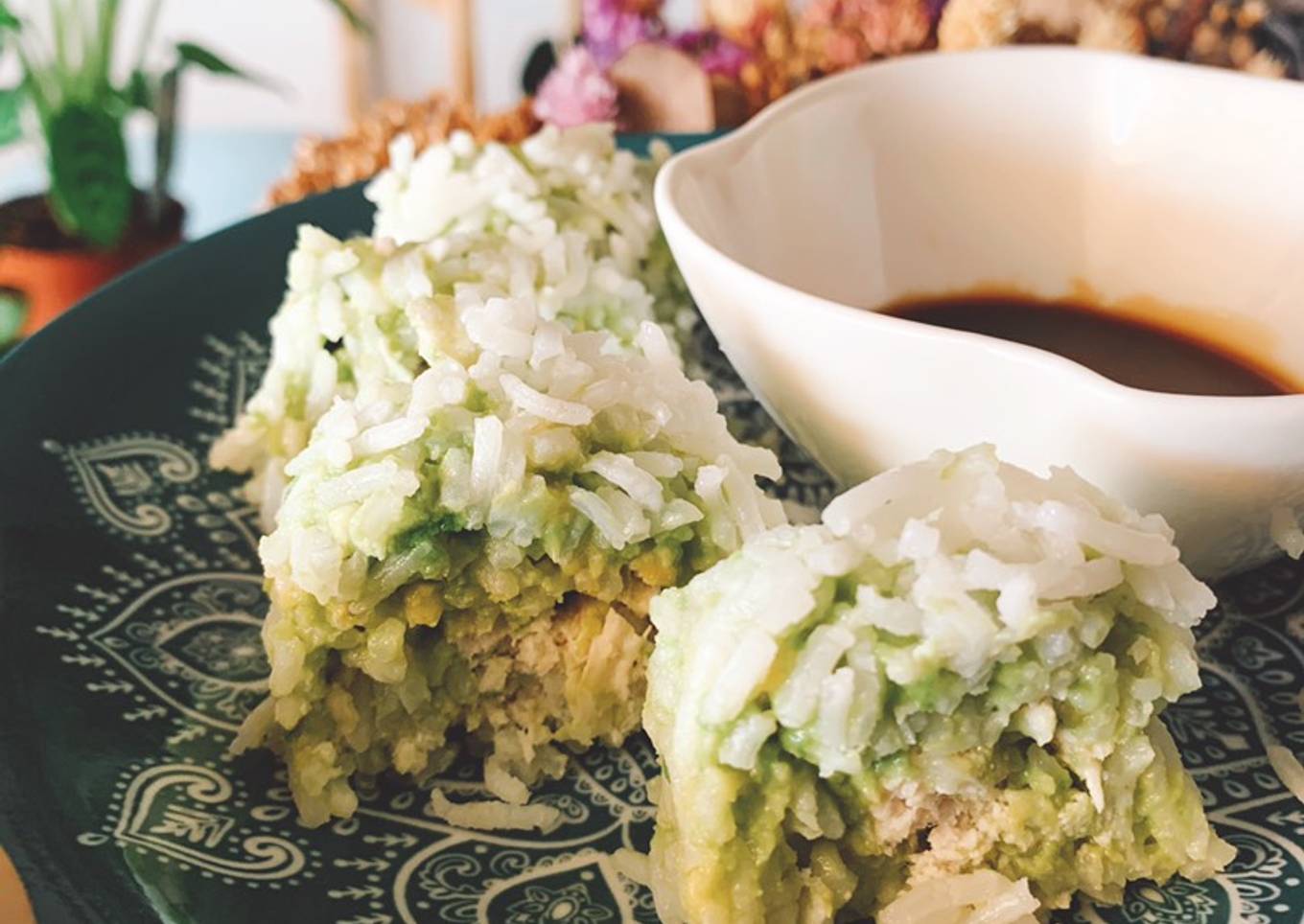 “Sushi” de arroz, aguacate y pollo con salsa de soja dulce