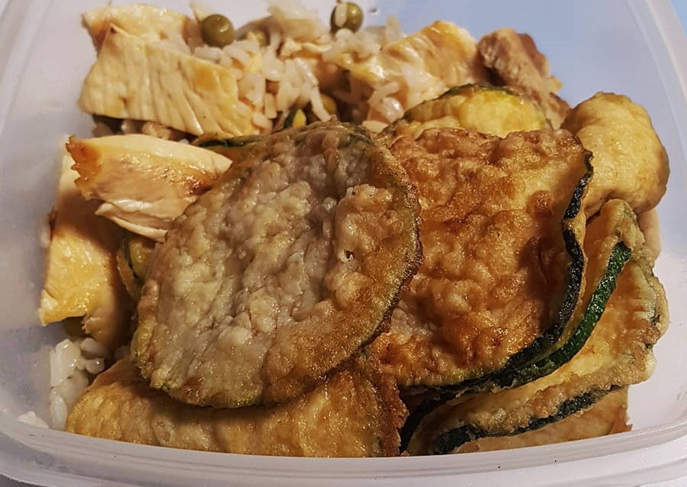 - Dejar que el arroz se dore un poquito y cuando esté listo añadir el calabacín rebozado y el pollo troceado.