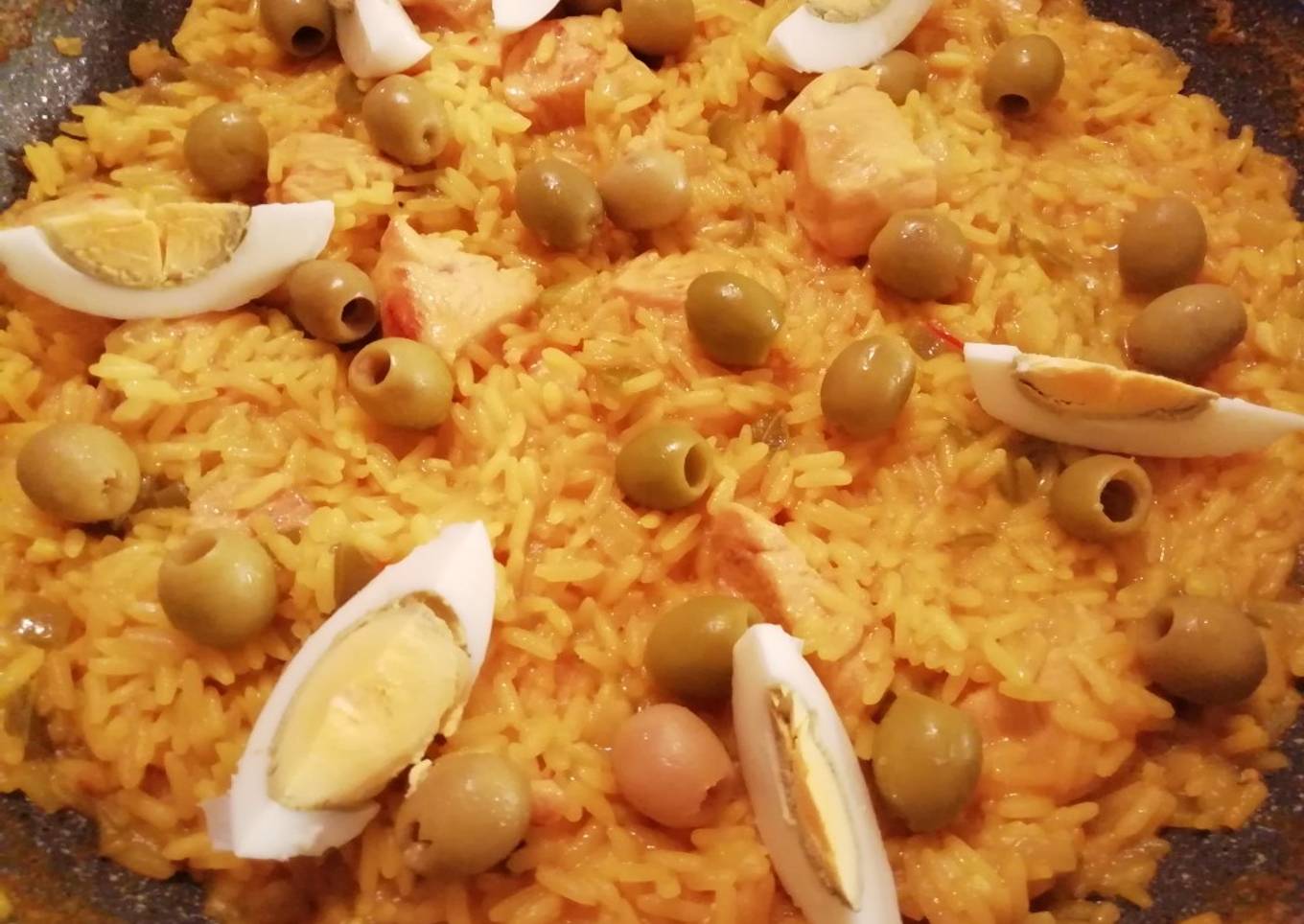 - Cuando el arroz esté echo a fuego medio. Cortamos el huevo cocido en gajos y lo ponemos por encima. Ponemos unas aceitunas por encima.
