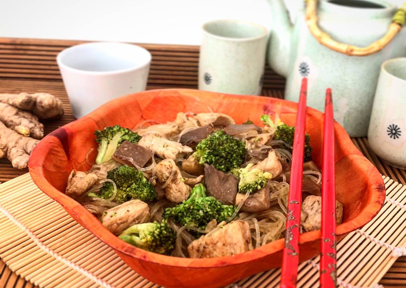 Fideos de arroz salteado con pollo, brócoli y setas