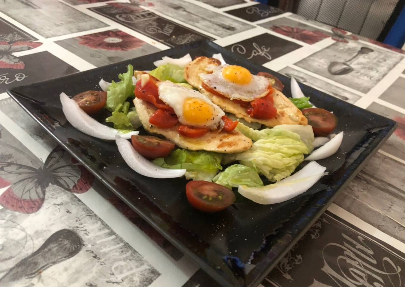 Milanesa de pollo con cama de ensalada pimientos asados y huevos de codorniz