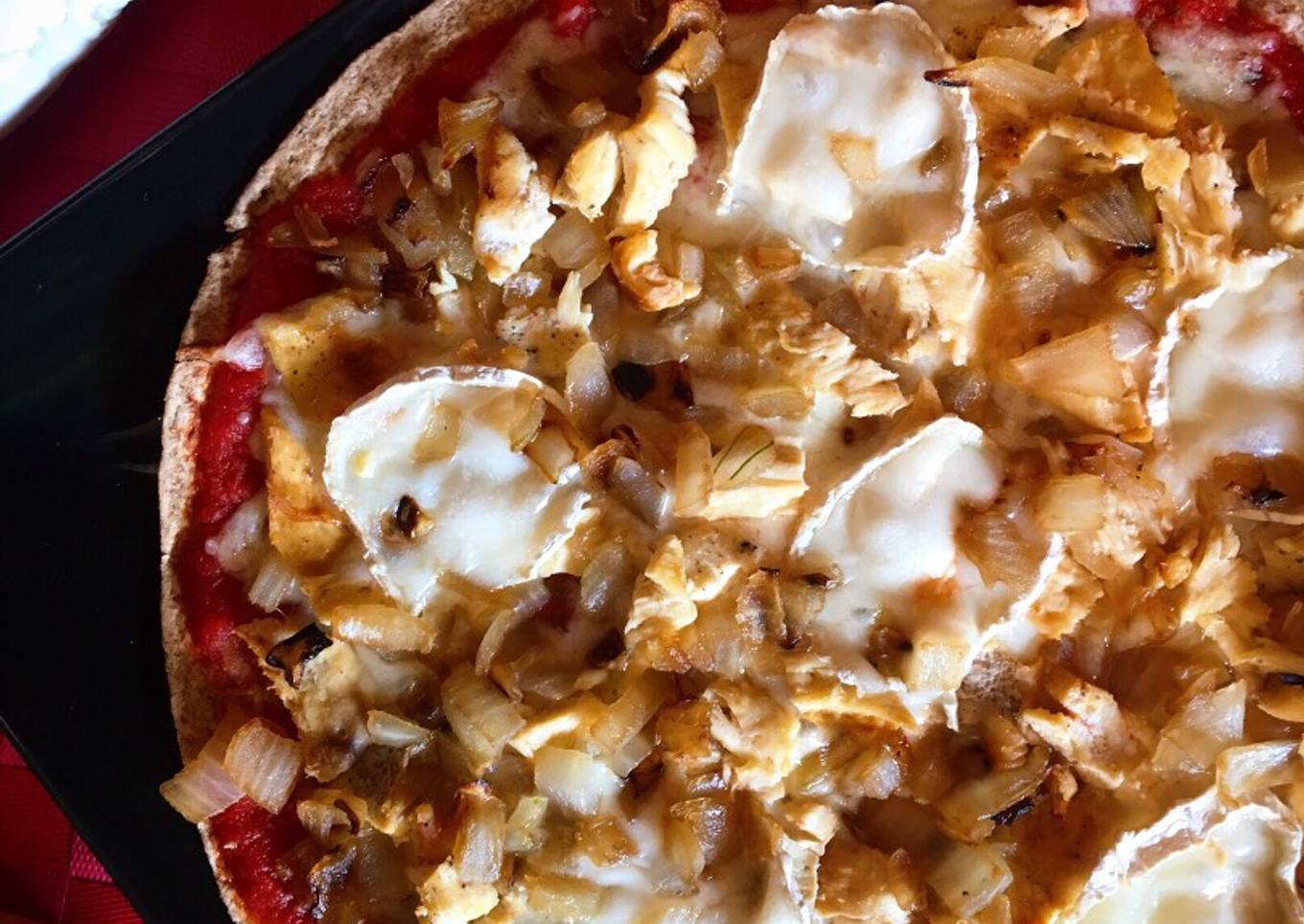 Steps to make to make Pizza fit de pollo, queso de cabra y cebolla caramelizada