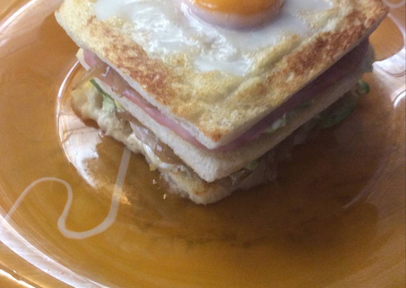 - Luego cebolla caramelizada, queso y por último pondremos la rebanada de pan