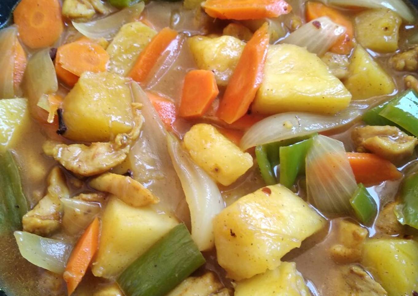 - Añadir las zanahorias, la salsa de pescado y la piña y cocinar 3 min. Añadir la maicena, cocinar hasta que espese y listo!!!! Servir en un cuenco con arroz hervido.