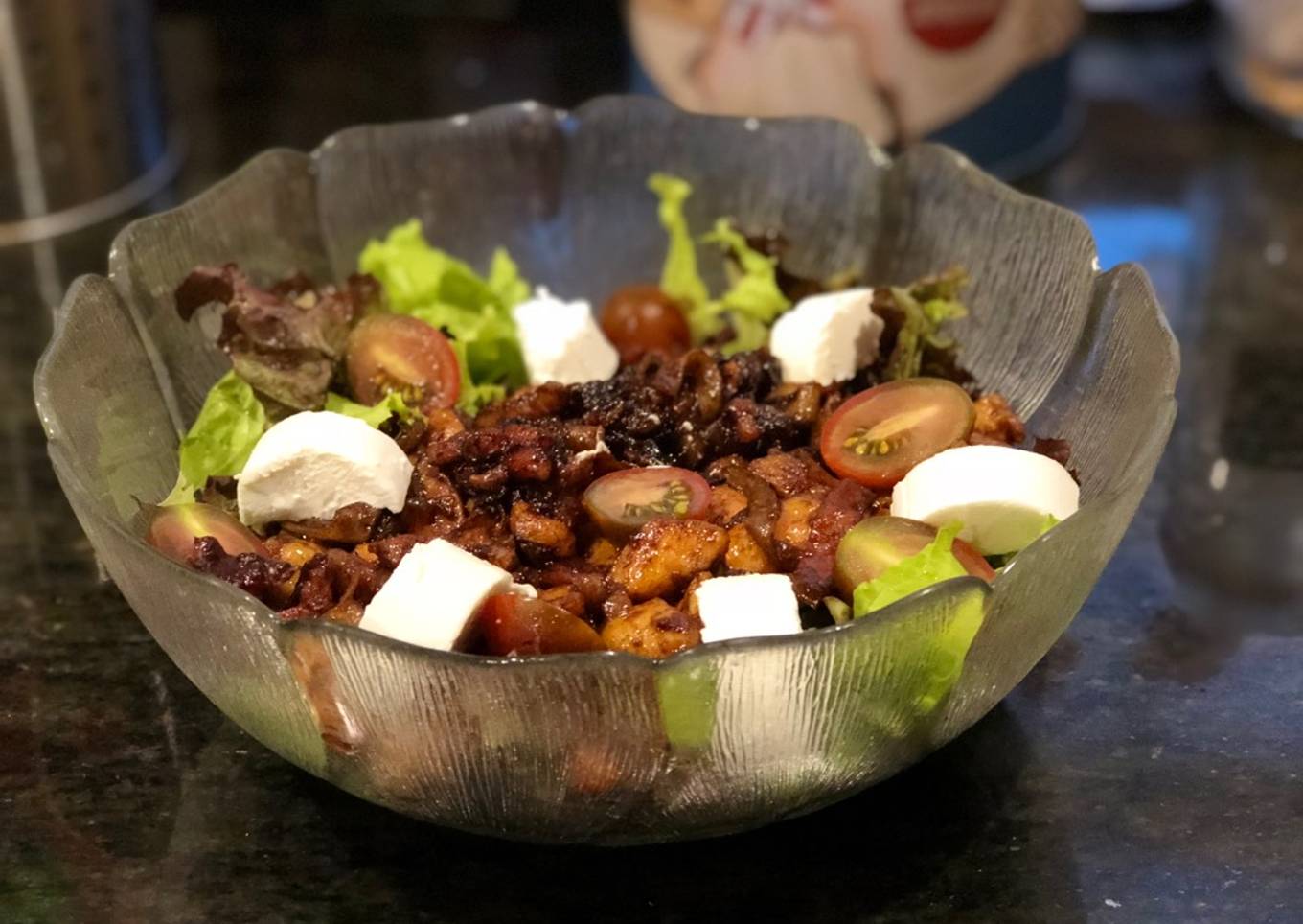 Ensalada templada de pollo y gambas con mermelada de melocotón
