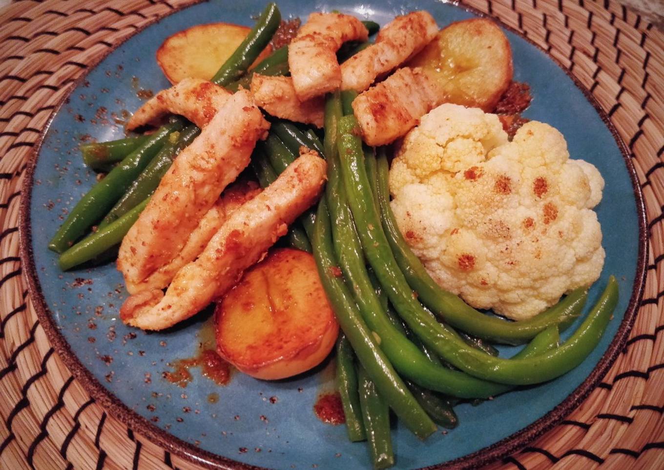 - Emplatamos las tiras de pechuga con las judías. Podemos acompañar de otras verduras o patatas. Yo he optado por un poco de coliflor y rodajas de patata. Añadimos más mojo al gusto.