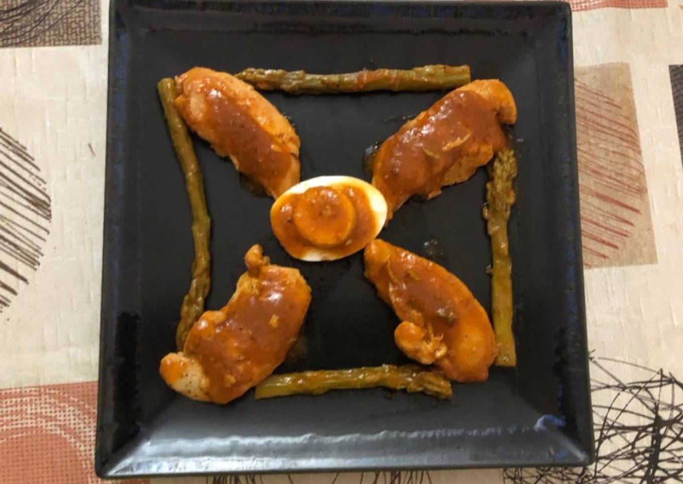 Instructions to make to make Solomillo de pollo con salsa al curry, espárragos trigueros y huevo cocido