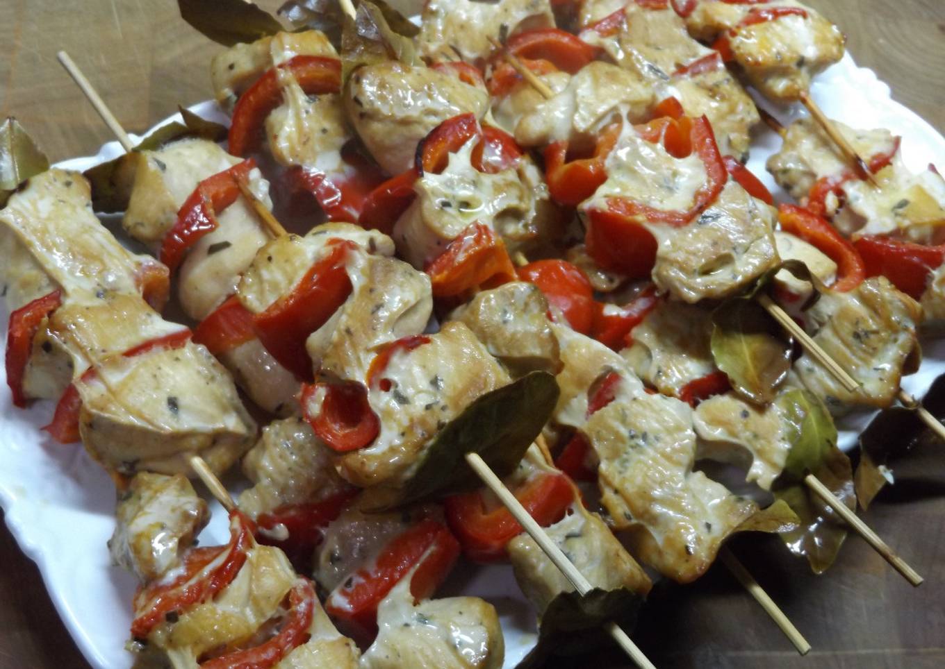 - En un cuenco poner la salsa de soja, la salsa Worcestershire, el romero y el tomillo bien picados. Cortar las pechugas, después de quitar todo resto de piel, grasa, y huesos. Deben ser pequeños porque las brochetas son para comer con los dedos.Sumergirlos en la mezcla y dejar macerando toda la noche. Lavar y secar el pimiento. Quitar las semillas y cortar en cuadraditos. Poner los palillos en agua para que no se quemen al poner las brochetas en el horno. Montar las brochetas alternando el laurel
