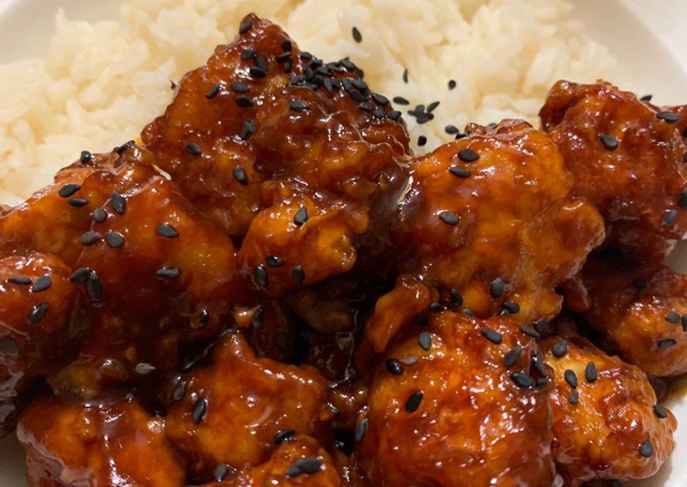 - En una sartén tipo wok de preferencia mezcla los ingredientes de la salsa y mover hasta diluir el azúcar. Cuando rompa a hervir incorporar el pollo y cocinar a fuego medio-bajo hasta que reduzca la salsa