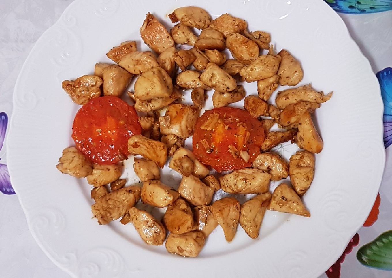 - Lavar y cortar por la mitad los tomates y añadirles sal y pimienta negra y añadirlos al pollo y mantener en el fuego 3 minutos y apartar