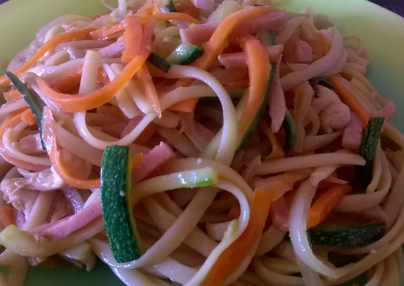 - Ponemos una cacerola con agua y sal a hervir y mientras ponemos una sartén al fuego con un chorrito de aceite para saltear las verduras. Queremos que se nos queden duritas y crujientes por lo que NO les pondremos sal, no las cocinaremos mucho y lo haremos con fuego medio alto (que no nos suelten jugos) y por separado, primero las zanahorias, luego el calabacín, la cebolla, una chispa de calor al jamón de york (cuidado que se pega).. y vamos reservando todo junto en un bol.