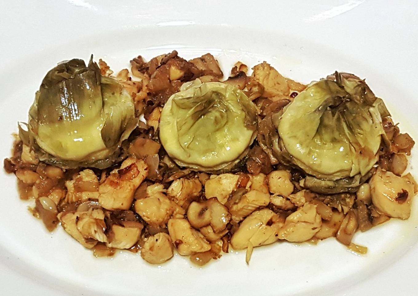 Corazones de alcachofa con lecho de pollo, cebolla y champiñones