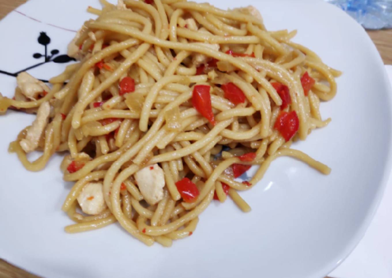 - Mezclamos los espaguetis con la verdura y la pechuga y añadimos un poco de soja.