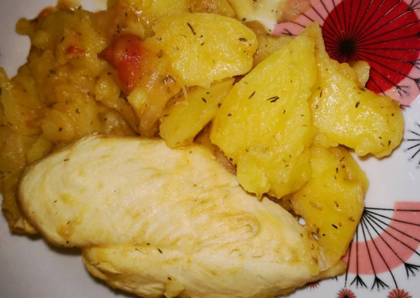 Steps to make to make Pollo con patatas al horno sin horno 😊
